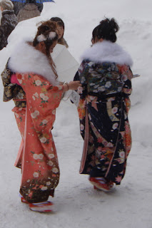 I did find the event hall and stood outside watching the 20 year olds arrive for about half an hour. Unfortunately, my camera battery died quickly in the cold, so I was only able to take a few (bad) pictures. The kimonos were beautiful. Most of the young men were wearing dark suits, but a few were wearing the men’s version of the kimono. The hairstyles for both the men and the women were elaborate, with flowers and jewelry in the hair of the women. The women all wore shoes that were like a red patent leather flip flop inside of a clog. The snow was coming down hard, landing like sparkles in their hair.