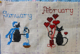 This year I plan to stitch the calendar cats (free charts at Happiness is Cross Stitching). One small ornament per month, so this month is February. I will wait to finish them all at the same time in December so that they will be the same size and somehow coordinate.